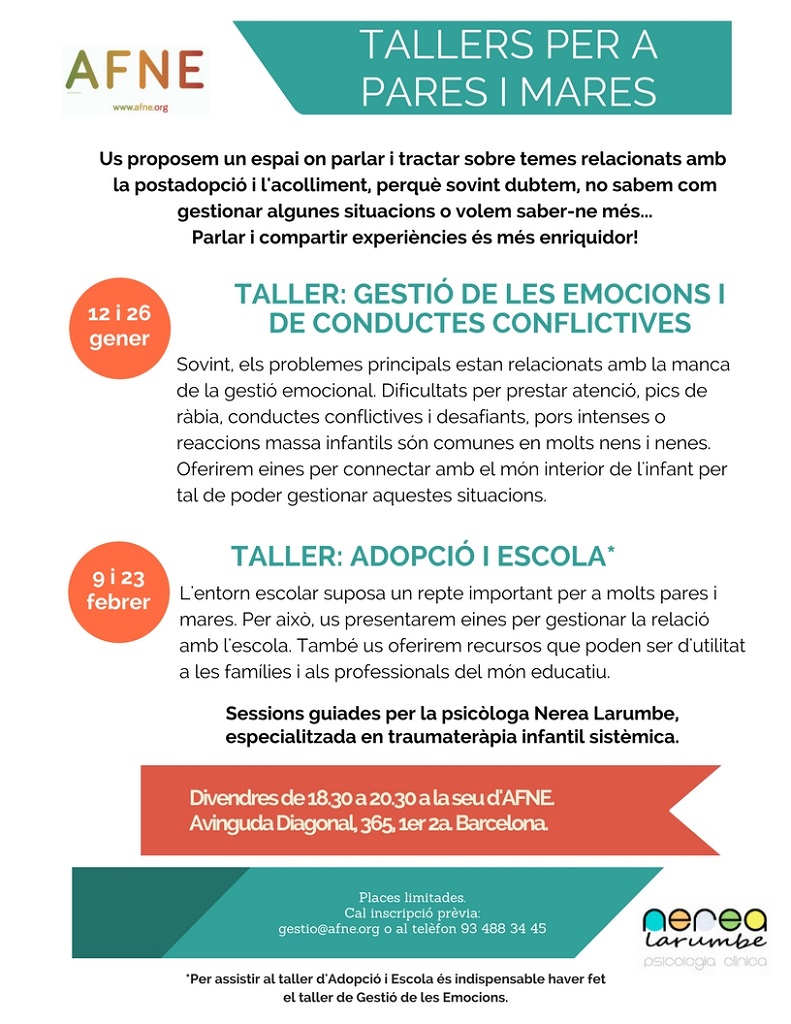 Comencem l’any 2018 amb una nova edició dels Tallers per a pares i mares amb la Nerea Larumbe, psicòloga infantil i juvenil especialitzada en traumateràpia infantil sistèmica. Els tallers estan pensats per oferir un espai on parlar i tractar sobre temes relacionats amb la postadopció i l’acolliment.
