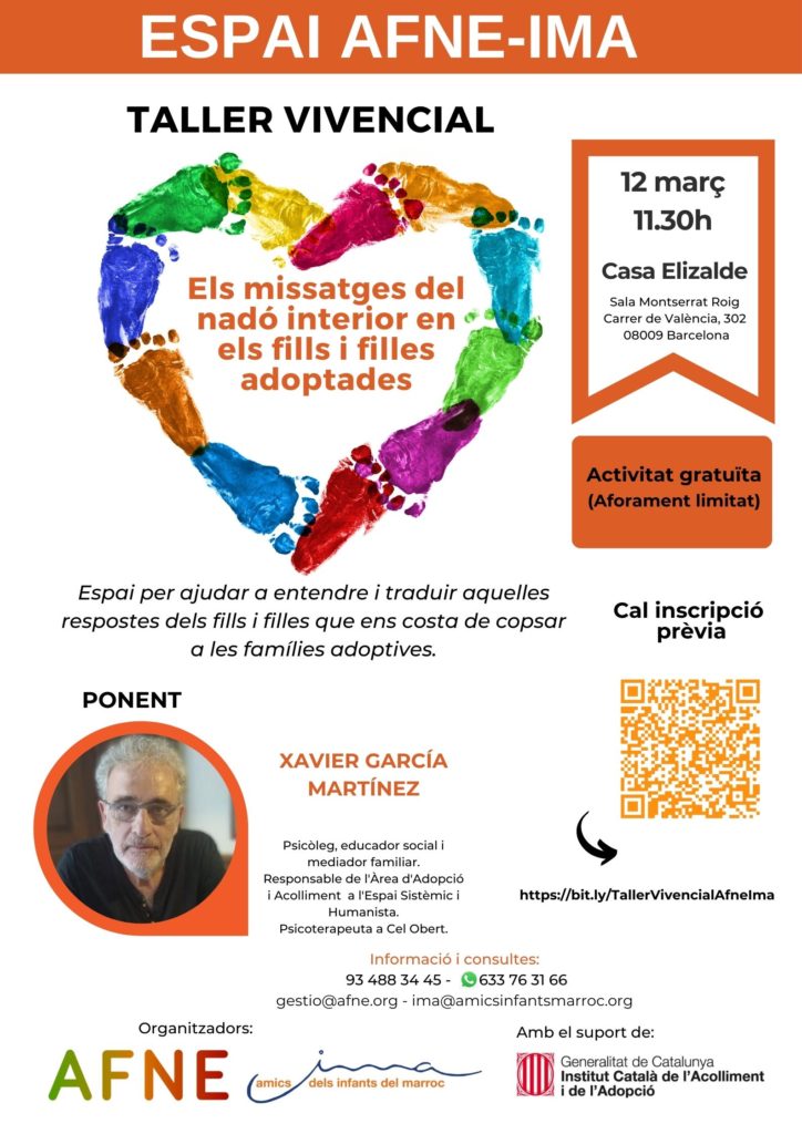 Us convidem el proper dissabte 12 de març a les 11.30h a la Casa Elizalde al Taller vivencial “Els missatges del nadó interior en els fills i filles adoptades” organitzat per AFNE i IMA, amb el suport de l’Institut Català de l’Acolliment i l’Adopcio (ICAA) de la Generalitat de Catalunya,
