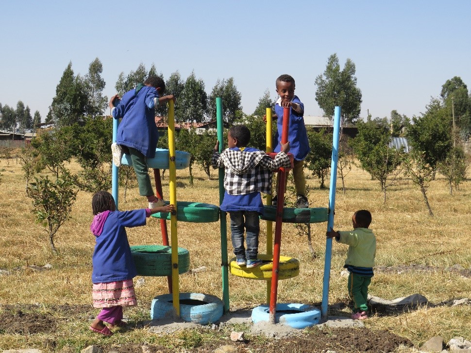 El diseño de este proyecto, financiado por AFNE gracias a un premio convocado por el Ayuntamiento de Barcelona y ganado por la asociación, ya estaba pensado y listo y sólo faltaba llevar a cabo la construcción de los diferentes juegos. En un primer momento pensé que sería sencillo y que en una semana podríamos tener, sino terminado, muy avanzado. Pero no fue así porque la cadena de pasos que había que hacer antes de que pudiera venir el herrero a hacer el montaje era más larga y complicada de lo que me esperaba. Primero necesitábamos los neumáticos, que compramos en Addis Abeba y eran la base de la mayoría de juegos. Después había que pintarlos, tarea que hacíamos nosotros mismos. Para pintarlos había pintura, pinceles (como es evidente) y sobre todo aguarrás, porque si no era imposible quitarse la pintura de las manos (el primer día lo constatamos).