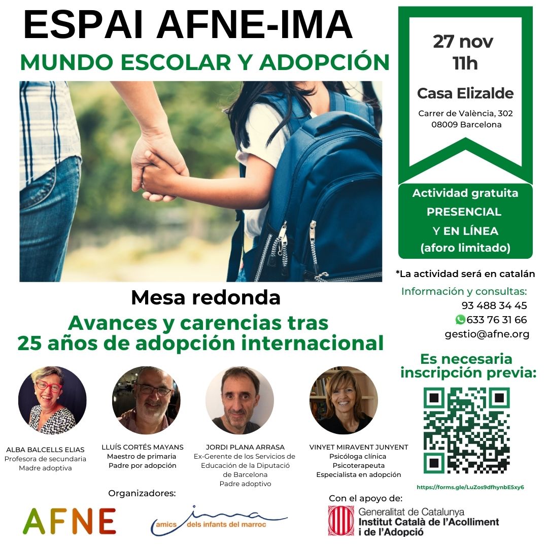 La actividad tendrá lugar en la Casa Elizalde de Barcelona (Calle València, 302) y también se podrá seguir on line. Es una actividad gratuita, que organizamos conjuntamente con la asociación IMA-Amics dels Infants del Marroc, y que se realizará en catalán porque es una de las actividades subvencionadas por el ICAA (Institut Català de l’Acolliment i de l’Adopció). Es necesaria inscripción previa.