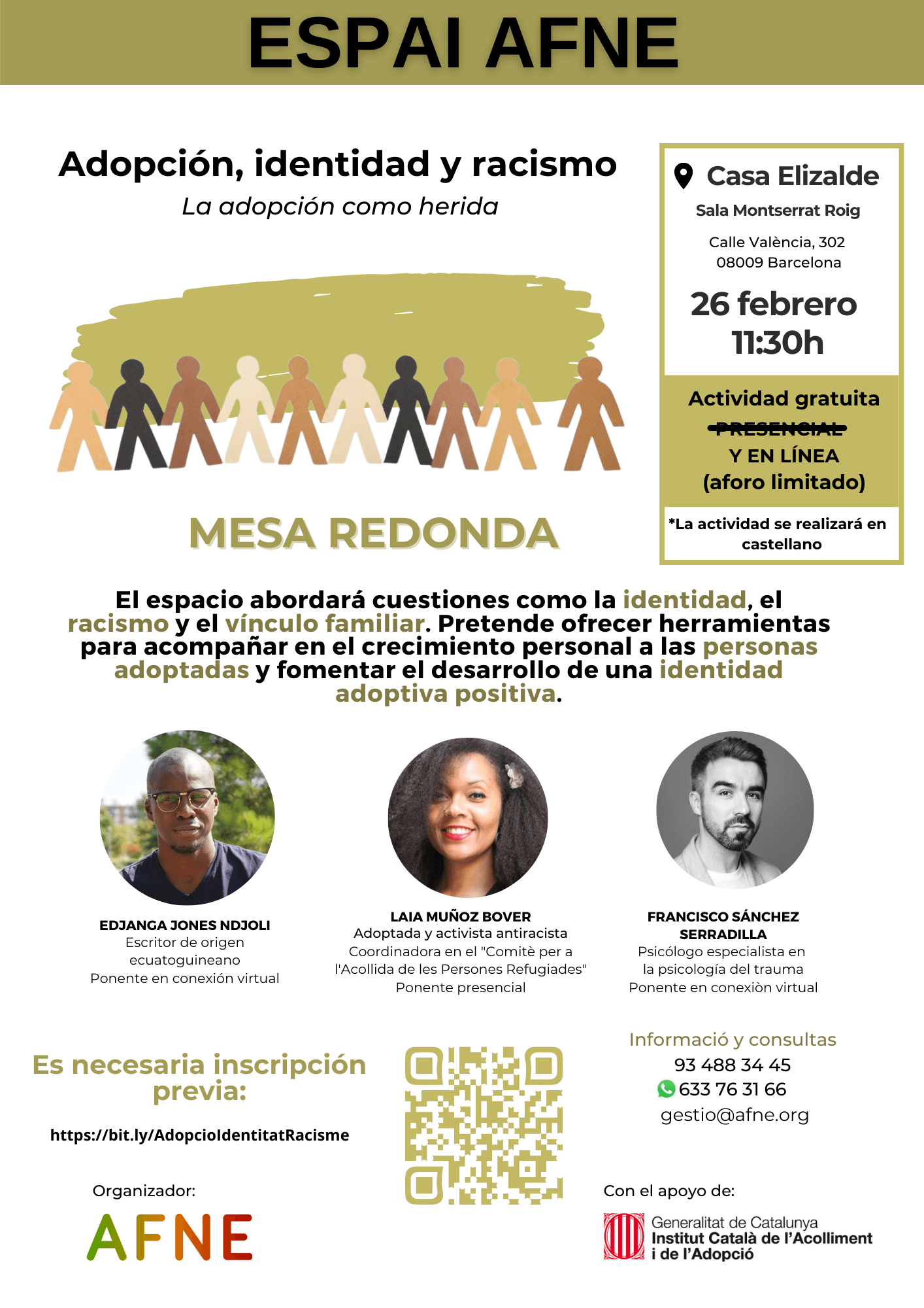 El próximo 26 de febrero os invitamos a un nuevo Espai AFNE en el que abordaremos cuestiones como la identidad, el racismo y el vínculo familiar. La mesa redonda pretende facilitar herramientas para acompañar a las personas adoptadas en el crecimiento personal y fomentar el desarrollo de una identidad adoptiva positiva.