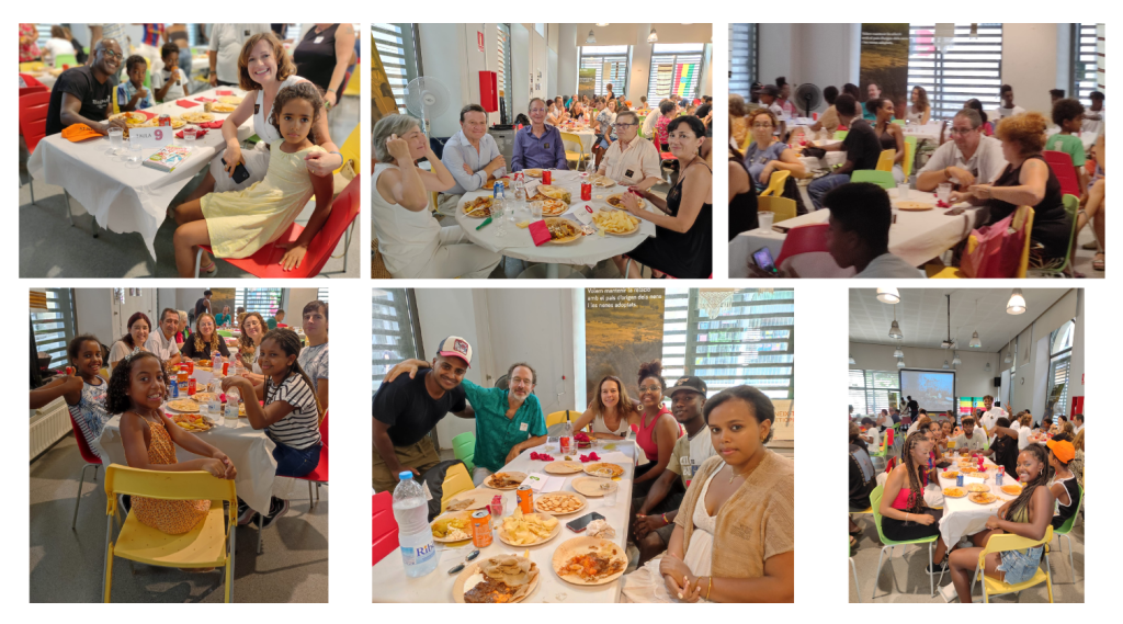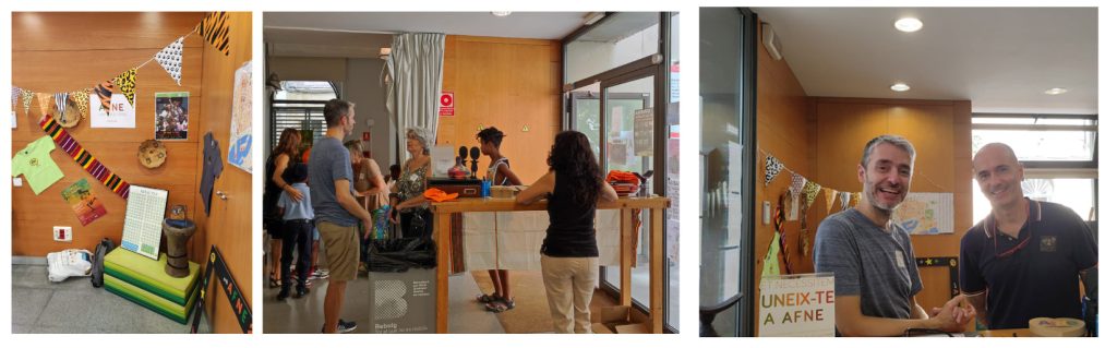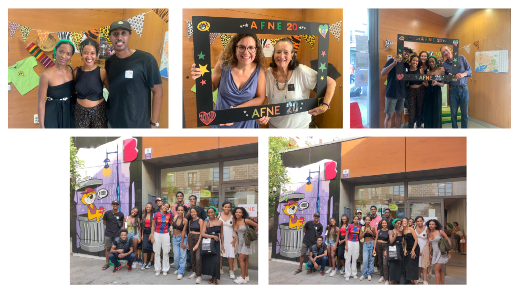Cuando hacia las 12.00 del mediodía empezaron a llegar las primeras familias, fueron recibidas por un espacio preparado y decorado con cuidado y afecto. La mesa de recepción, la sala llena de mesas y sillas, las paredes decoradas con banderas de Etiopía y carteles que recordaban actividades hechas a lo largo de todos estos años, la parada con productos de la asociación, un photocall lleno de color de donde poder marchar con un bonito recuerdo de aquel día, el equipo de imagen y sonido, un pequeño bar con bebidas frescas… Todo gracias al esfuerzo colectivo de muchas personas que trabajaron con dedicación durante semanas para asegurar que fuera perfecto.