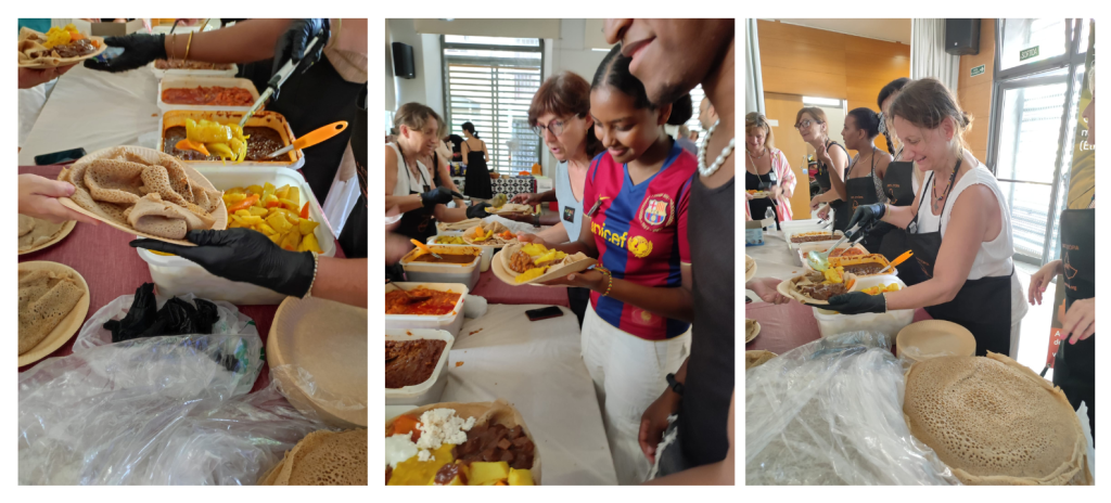 La sala estaba impregnada de los colores, la música y los afectos hacia Etiopía. Como no podía ser de otro modo, era el momento de incorporar el aroma irresistible de la injera y sus salsas, comida tradicional etíope, gracias a la generosidad del restaurante Addis Abeba y Warka. No defraudó. Deliciosa. Nuestro agradecimiento desde estas líneas a Abraham y todo su equipo por la predisposición y colaboración mostradas.