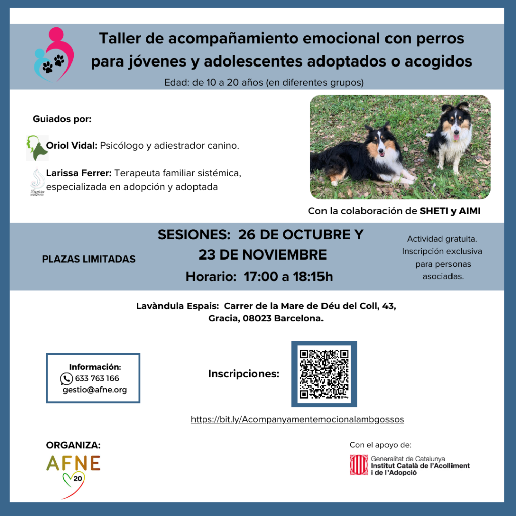 Guiadas por Larissa Ferrer (terapeuta familiar, sistémica especializada en adopción y adoptada) y Oriol Vidal (psicólogo y adiestrador canino). La actividad busca potenciar los beneficios del contacto entre los jóvenes adoptados y los animales: reelaboración de historia de vida, mayor control emocional, más autoestima, mejora de los procesos de aprendizaje y creación de red de apoyo entre los participantes.